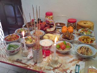Below is the array of food offered on this day. We also burnt some joss papers and his clothes for him after prayers. We are keeping some of his clothes for memory sake.